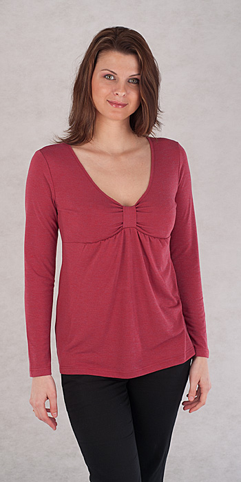 Описание модели: Блуза женская из трикотажного полотна полуприлегающего силуэта с V-образным вырезом горловины и длинным рукавом. Блуза отрезная под грудью. Верхняя часть переда собрана на "перепонку". Верх нижней части переда немного присборен. Длина изделия: р. 44-48 около 60 см и р. 50-52 около 65 см