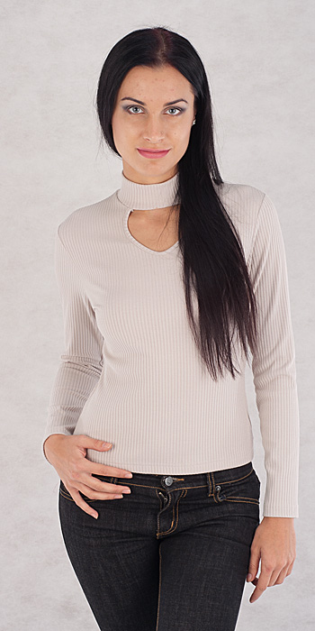 Описание модели: Блуза женская из трикотажного полотна "лапша" прилегающего силуэта с воротником "стойка" и V-образным вырезом горловины. Рукав длинный. Длина изделия р. 44-48 около 52 см и р. 50-52 около 60 см.