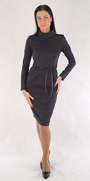 Описание модели: Платье женское прилегающего силуэта из плотного трикотажного полотна. Рукав длинный. Верхняя часть рукава со складками. Платье отрезное по линии талии. Нижняя часть платья со складками и карманами. По спинке средний шов с застежкой на потайную молнию. Внизу платья разрез 20 см. Воротник хомут. По талии шлевки и декоративный пояс из кожзаменителя. Длина изделия около 102 см.