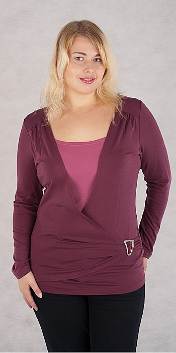 Описание модели: Блуза женская из трикотажного полотна полуприлегающего силуэта с длинным рукавом. Перед "ложная двойка". Горловина внутренней части переда круглая, внешней части переда "на запах". Внизу с левой стороны пряжка. Спинка на кокетке, плечевые швы переходят на перед. По плечевым швам переда небольшая сборка. Длина изделия около 64 см.