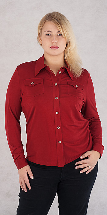 Описание модели: Блуза женская из трикотажного полотна прилегающего силуэта с длинным рукавом на манжете застегивающейся на пуговицу. Воротник стояче-отложной. Посередине переда планка с застежкой на 7 пуговиц. На груди карманы с клапанами. Длина изделия около 57 см.