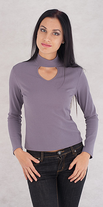 Описание модели: Блуза женская из трикотажного полотна "лапша" прилегающего силуэта с воротником "стойка" и V-образным вырезом горловины. Рукав длинный. Длина изделия р. 44-48 около 52 см и р. 50-52 около 60 см.