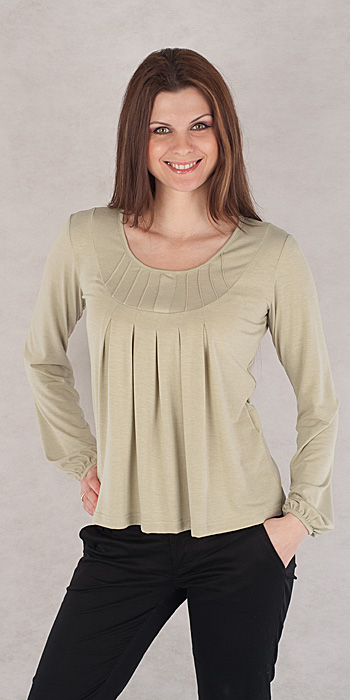 Описание модели: Блуза женская из трикотажного полотна с круглым вырезом горловины и длинным рукавом. Низ рукава собран на сборку. По переду кокетка с отделочными строчками. Под кокеткой складки. Длина изделия около 60 см.