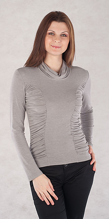 Описание модели: Женская блуза из трикотажного полотна прилегающего силуэта с длинным рукавом и воротником "хомут". По переду рельефные вставки, собранные на сборку. Длина изделия около 60 см.