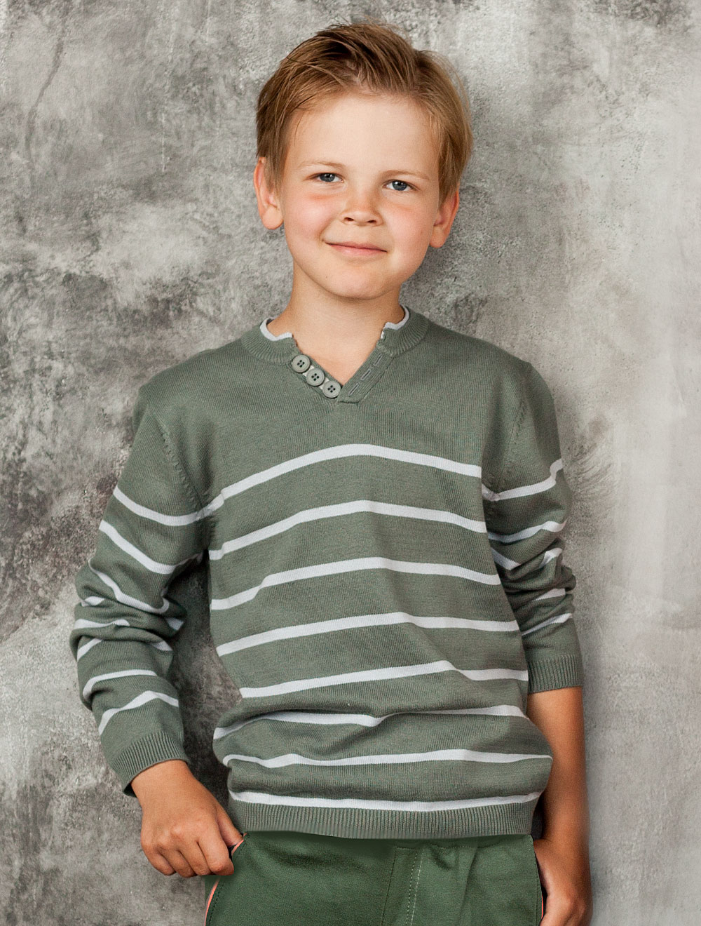 Описание: Джемпер с контрастными деталями и декоративными пуговицами.