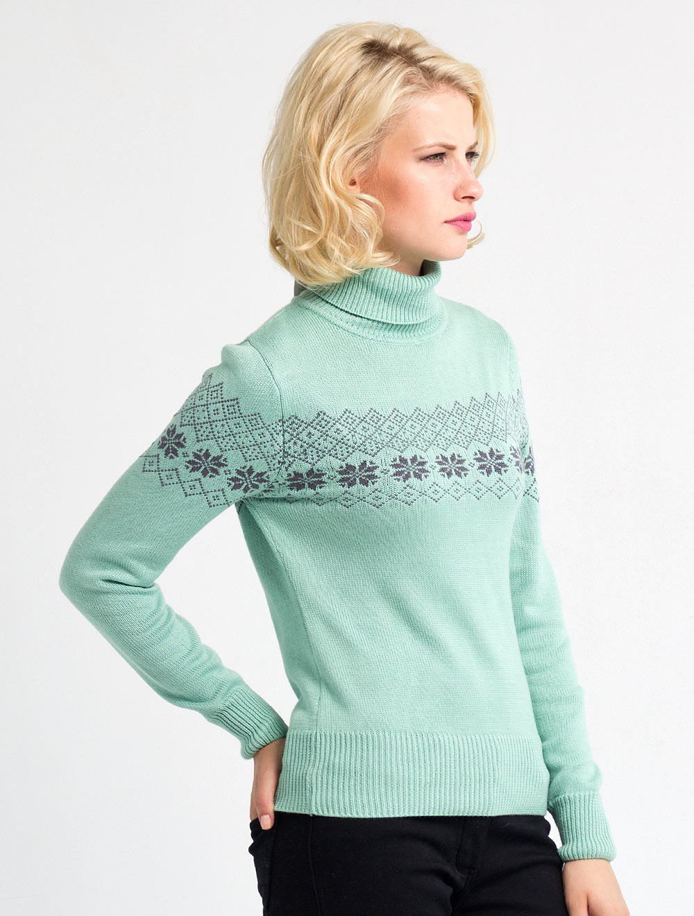 Описание: Джемпер классического полуприлегающего силуэта. Вязка средней плотности из хлопка. Изящный северный узор серого цвета.