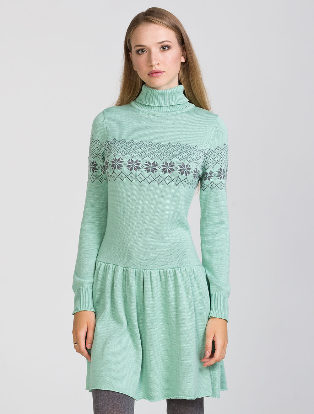 Описание: Мягкая вязка средней плотности. Высокая горловина. Заниженная линия талии и пышная юбка на легкой сборке. В больших размерах изделие по колено.