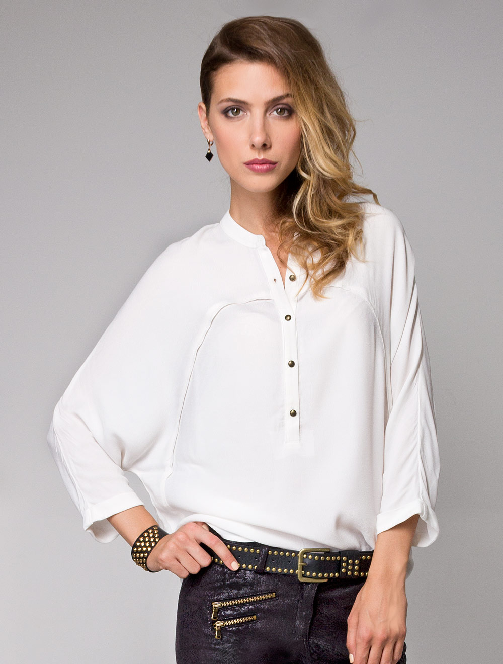 Описание: Матовая, фактурная вискоза. Свободная блузка с цельнокроеными рукавами. Перед и спинка украшены фигурными рельефами с вставкой- кантом.