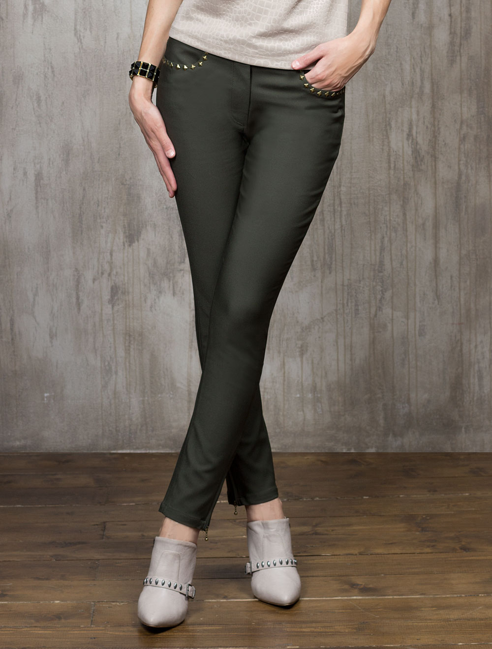 Описание: Плотная, эластичная и формоустойчивая немнущаяся ткань. Джинсовый крой. Карманы украшены заклепками-пирамидками, а один задний карман металлической молнией - цвета состаренное золото