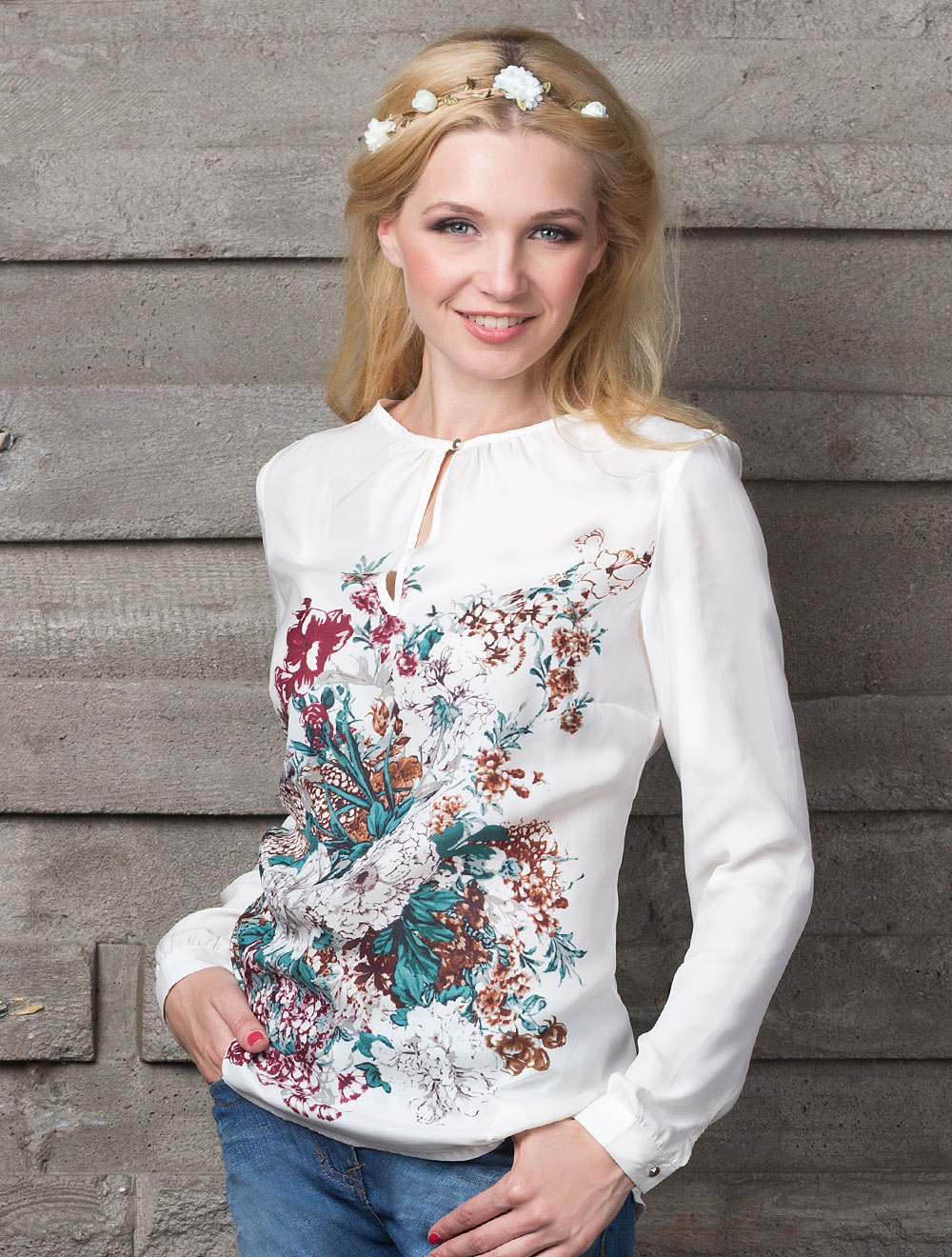 Описание: Тонкий, но малопрозрачный иск. шелк. Слегка приталенный силуэт, застежка на 1 пуговку спереди. Классические манжеты. Цветочный принт спереди.