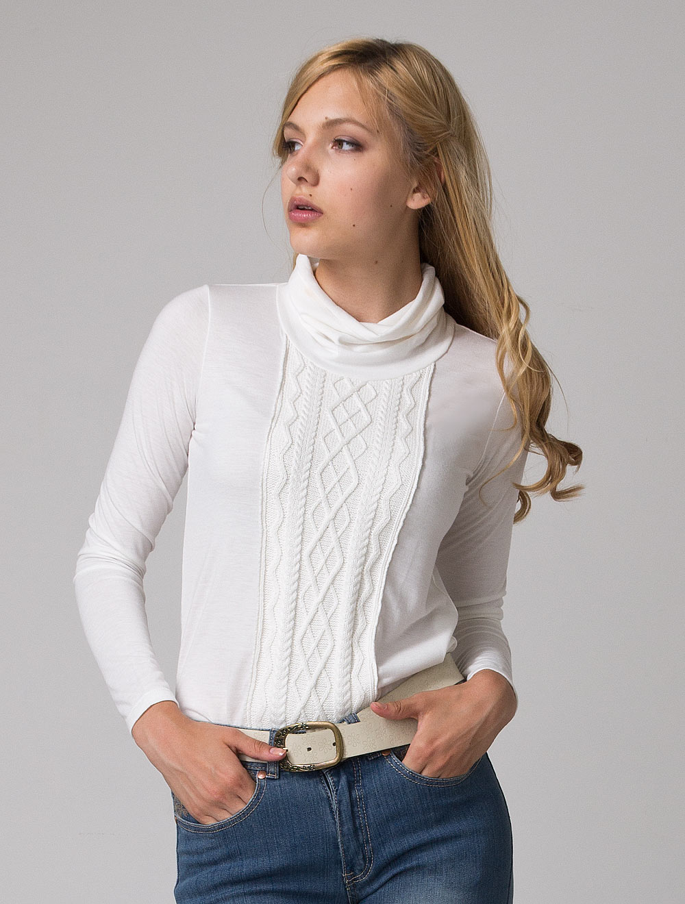 Описание: Тонкий трикотаж, перед украшен вязаной вставкой с рельефным узором