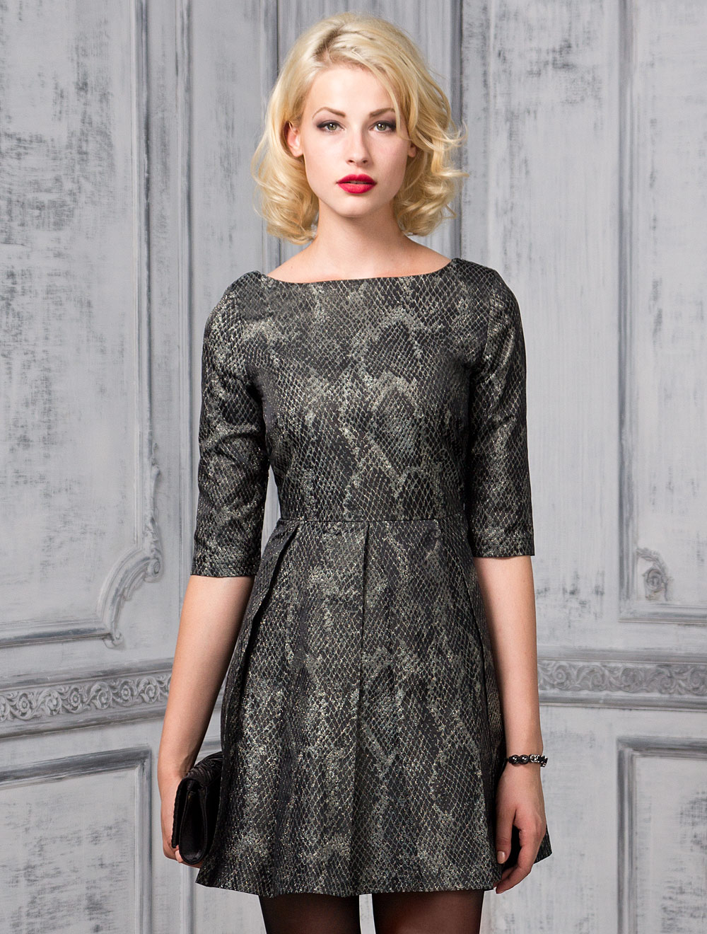 Описание: Платье из плотной тафты с золотым металлическим узором из люрекса в стиле питона. Юбка с глубокими встречными складками, расширенная к низу. На спинке металлическая золотая молния. Платье на подкладке из атласа.