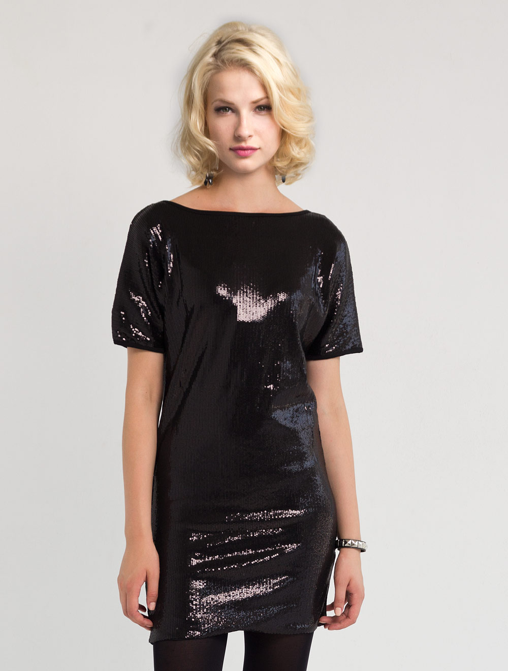 Описание: Платье выполнено из полотна, расшитого пайетками, горловина и проймы окантованы трикотажем. Возможно носить на обе стороны - перед и спинку менять