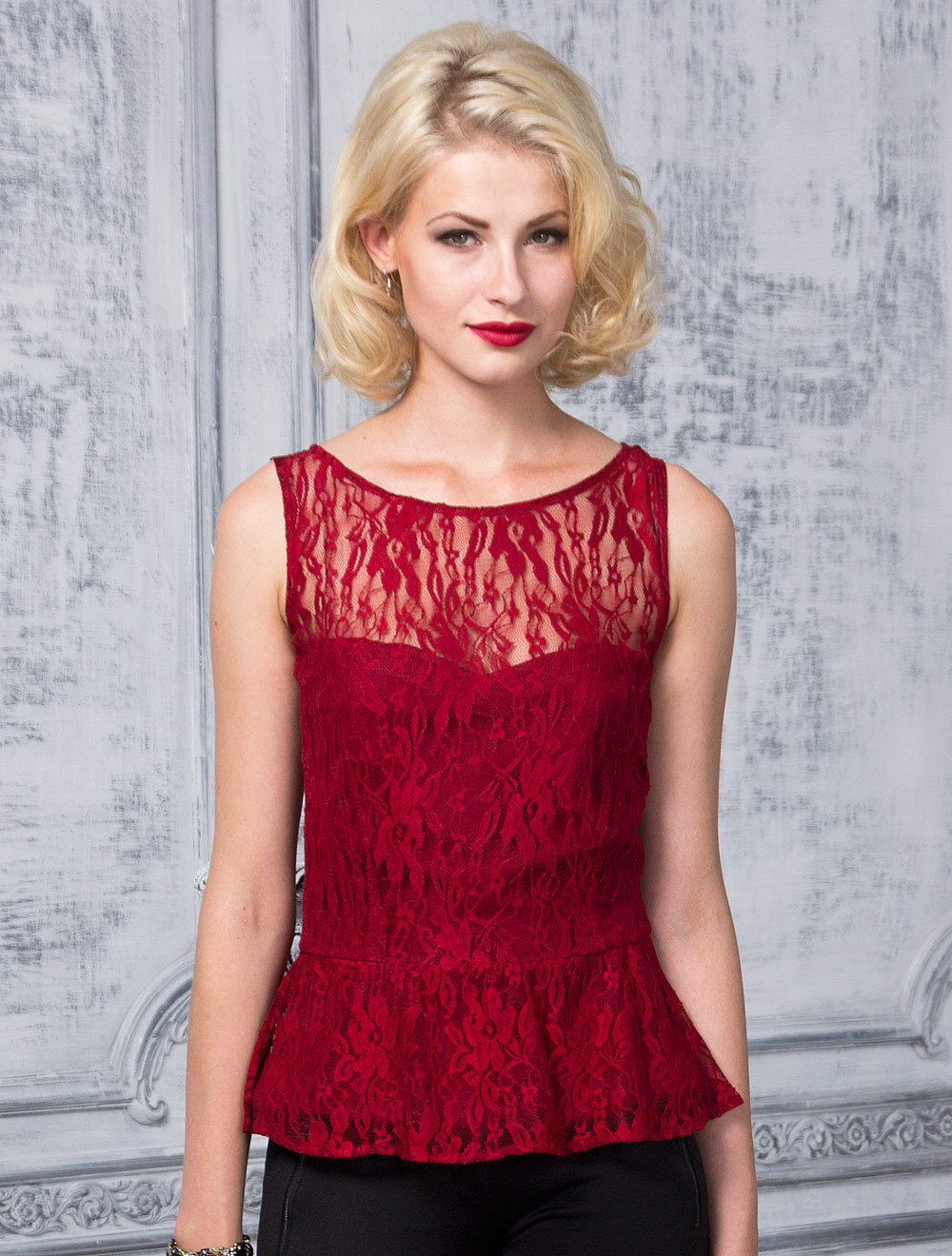 Описание: Топ из плотного трикотажа внутри, сверху - эластичный гипюр. Сзади застежка на пуговице и молнии. Для комфорта носки - верхня линия внутреннего топа изнутри обработана силиконом
