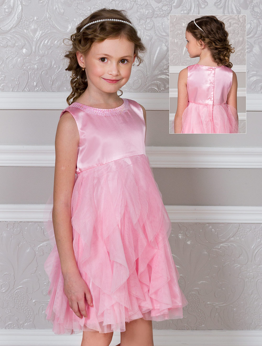 Описание: Атласное платье с вертикальными воланами на юбке, выполненными из мягкой сетки. Горловина спереди расшита пайетками. Подкладка верха - 100% хлопок, подкладка юбки - 100% ПЭ.