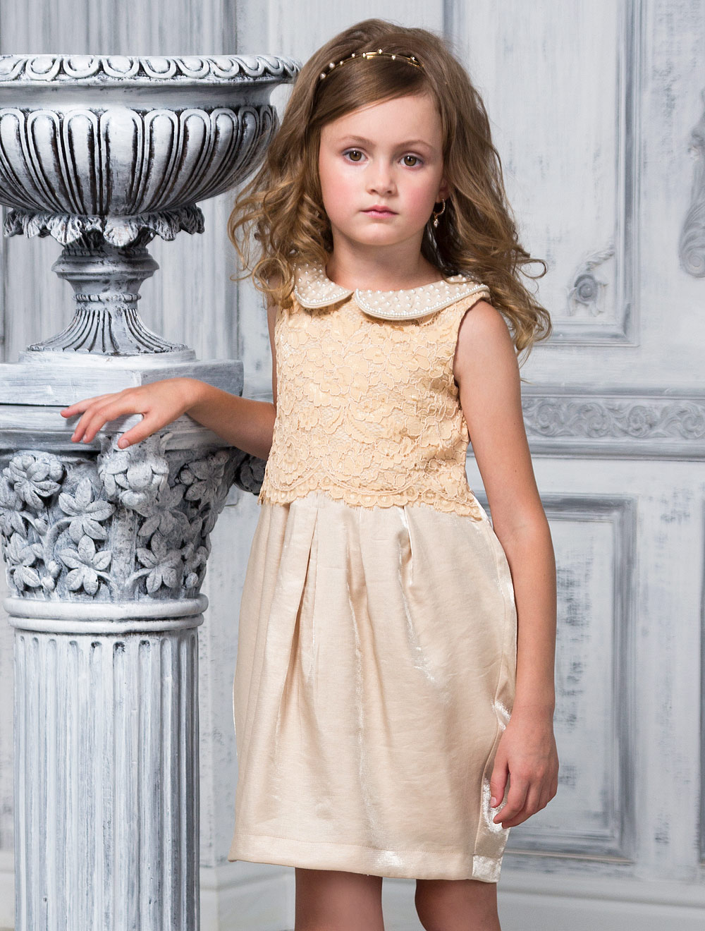 Описание: Платье выполнено из тафты. Передняя часть лифа накрыта фактурным кружевом. Воротник декорирован жемчужными бусинами. Юбка формы "тюльпан" со складками на талии.