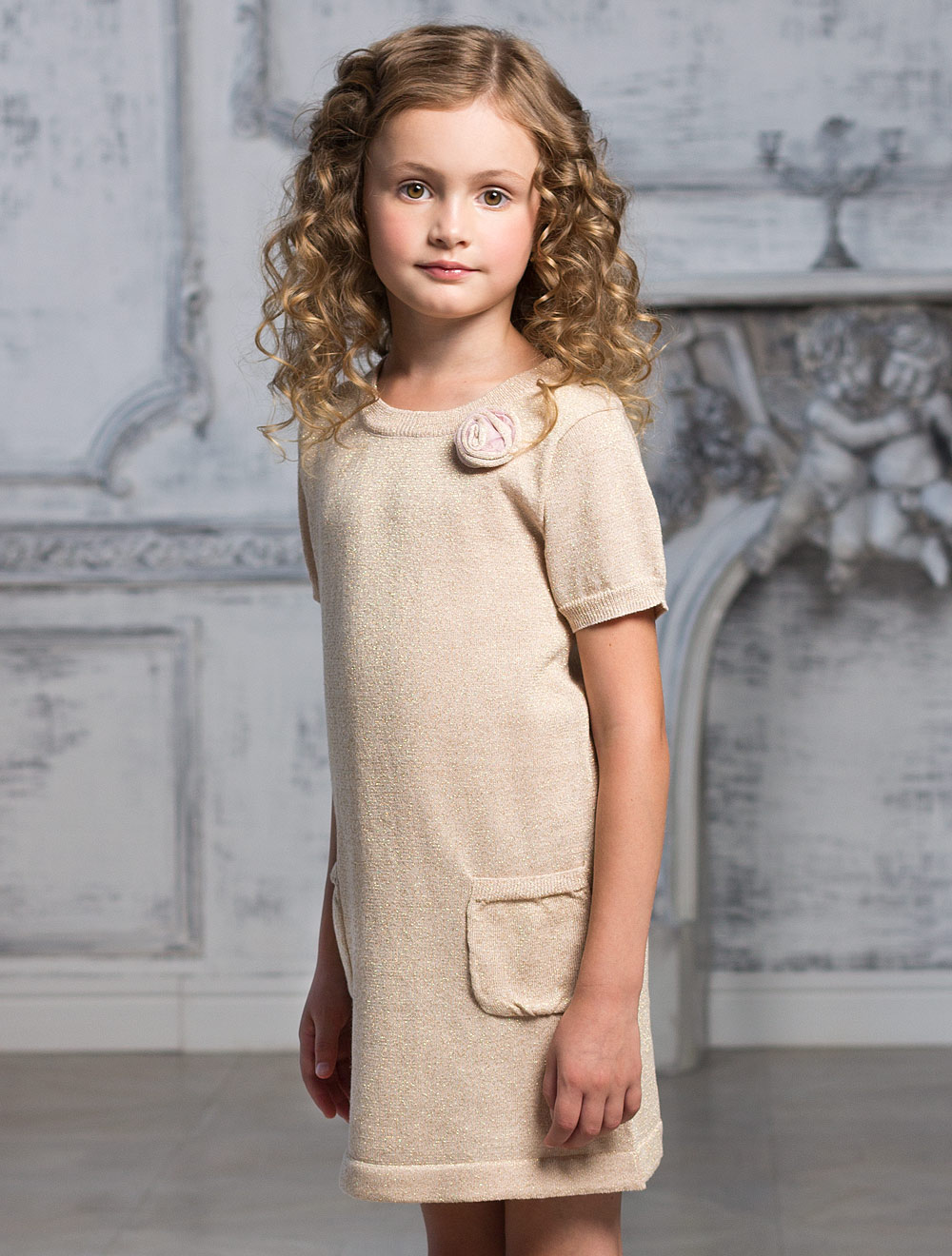 Описание: Вязаное платье с люрексом, украшение в виде розочки из ткани