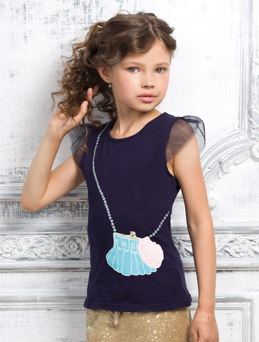 Описание: Футболка из эластичного хлопкового трикотажа. Рукава-крылышки выполнены из сетки. Принт в виде сумочки с цветком, цепочка которой выполнена из глиттера серебристого цвета.