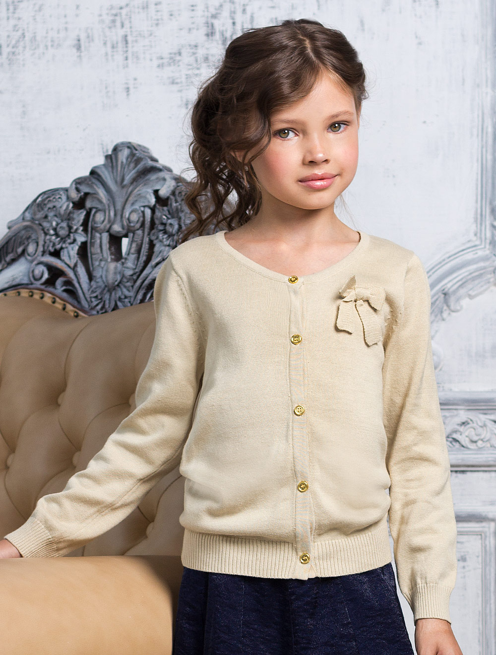 Описание: Жакет из тонкой хлопковой пряжи, декорированный бантом. Застежка на металлические пуговицы.