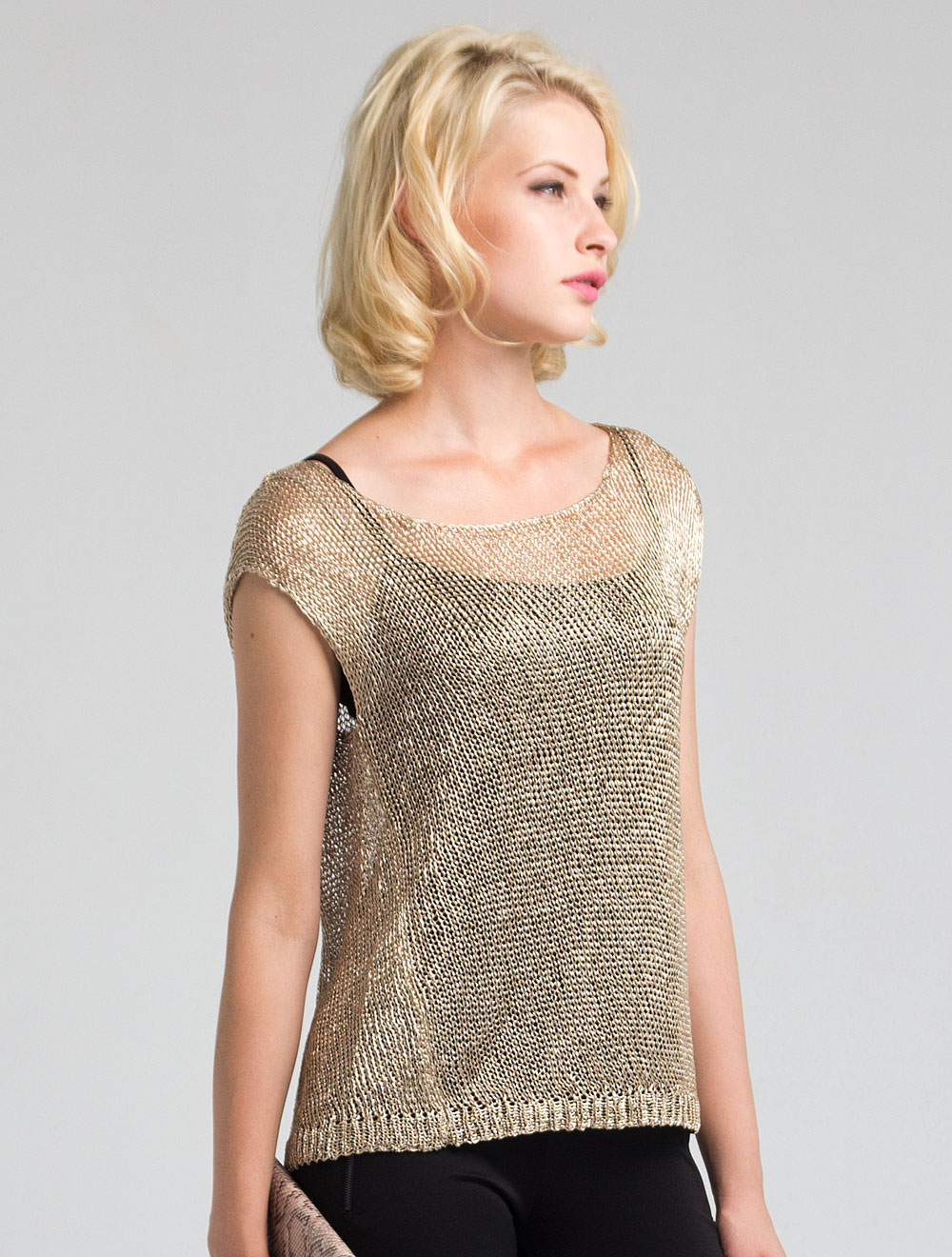 Описание: Выполнен и толстой нити золотого люрекса крупной свободной вязкой с ассиметричными боковыми швами.
