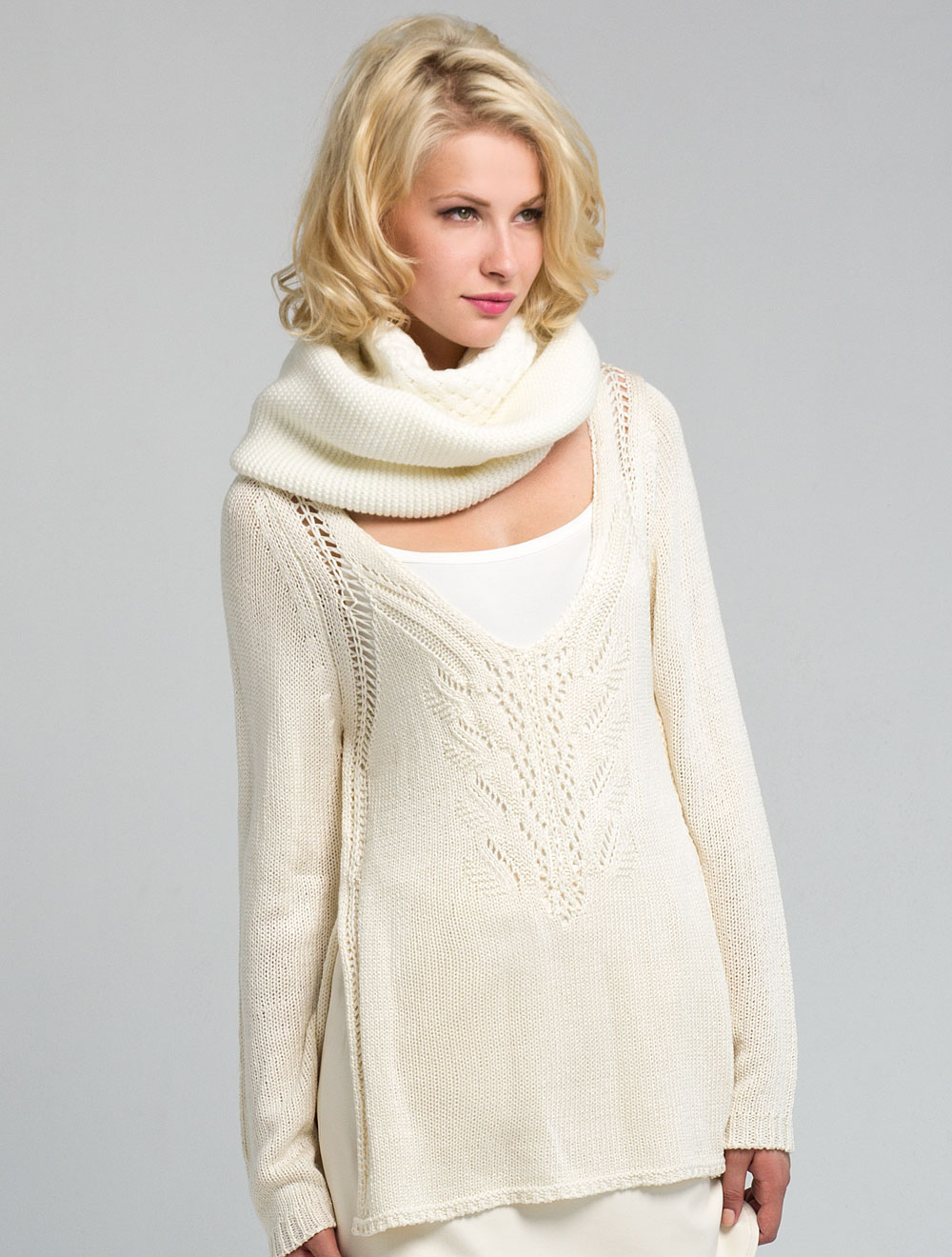 Описание: Крупная вязка из толстых нитей с атласным блеском, боковые разрезы от талии