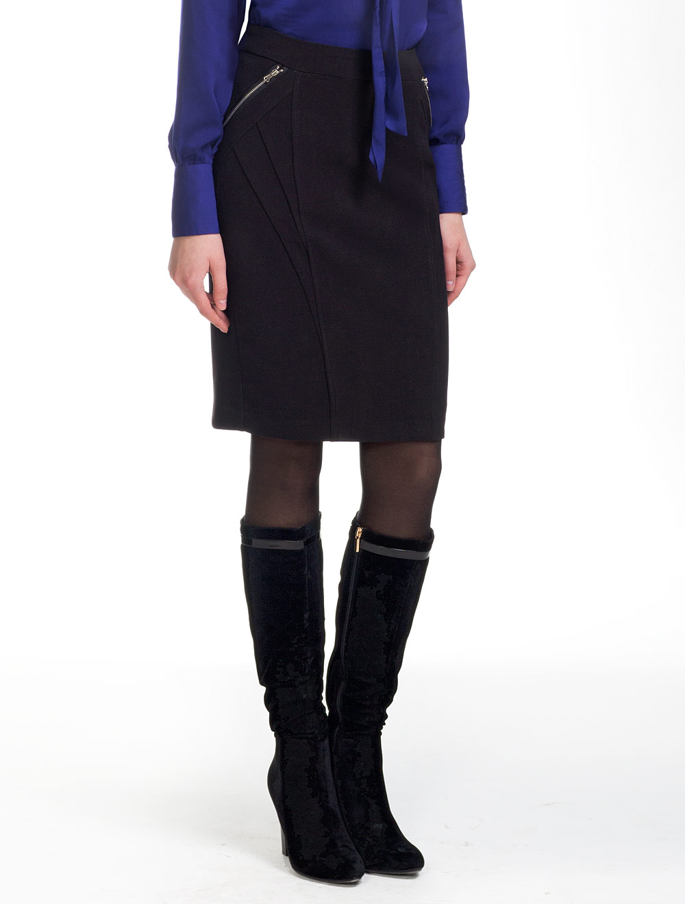 Описание: Плотная формоустойчивая ткань, боковые карманы на серебристых молниях, специфические линии кроя декорированы отделочными строчками. Юбка на подкладке.