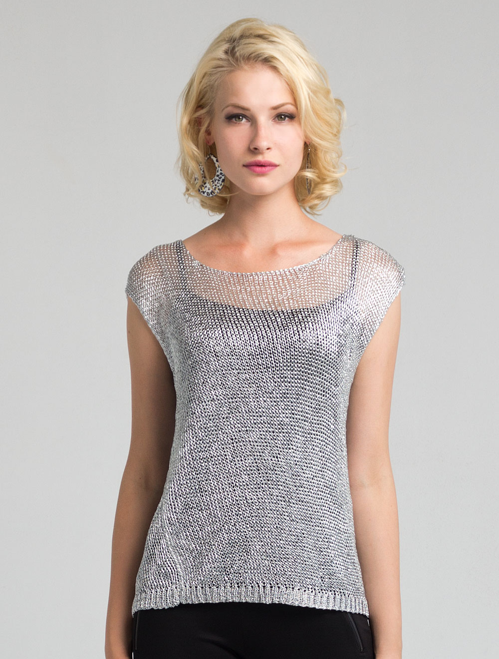 Описание: Выполнен и толстой нити золотого люрекса крупной свободной вязкой с ассиметричными боковыми швами.