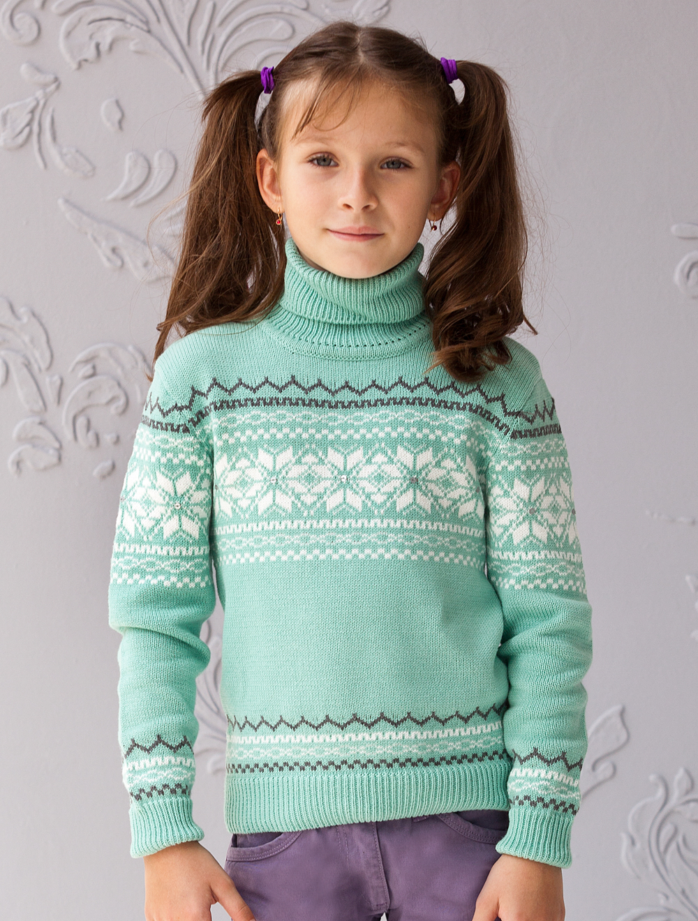 Описание: Свитер жаккардовой вязки, декорированный прозрачными пайетками.