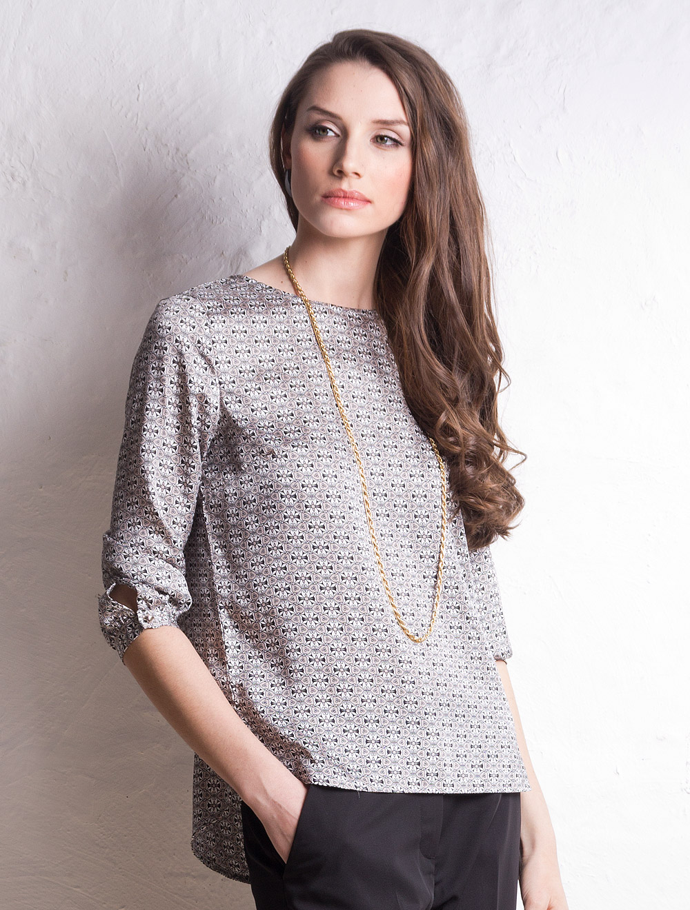 Описание: Блузка прямого силуэта, выполнена из атласной ткани с элегантным графичным рисунком. Спинка удлиненная с округлой линией низа, украшена металлической молнией. Рукав 1/2 на сборке и узкой манжете.