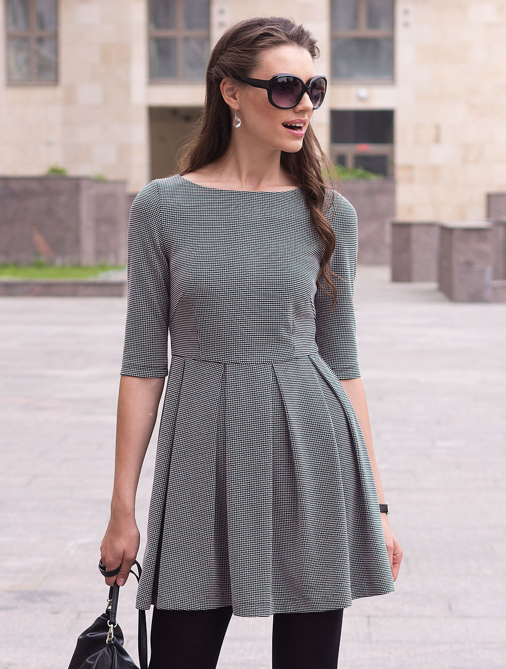 Описание: Платье выполнено из плотного трикотажного полотна с фактурным черно-белым переплетением. Трикотажная подкладка создает дополнительный комфорт в носке. В больших размерах платье по колено.