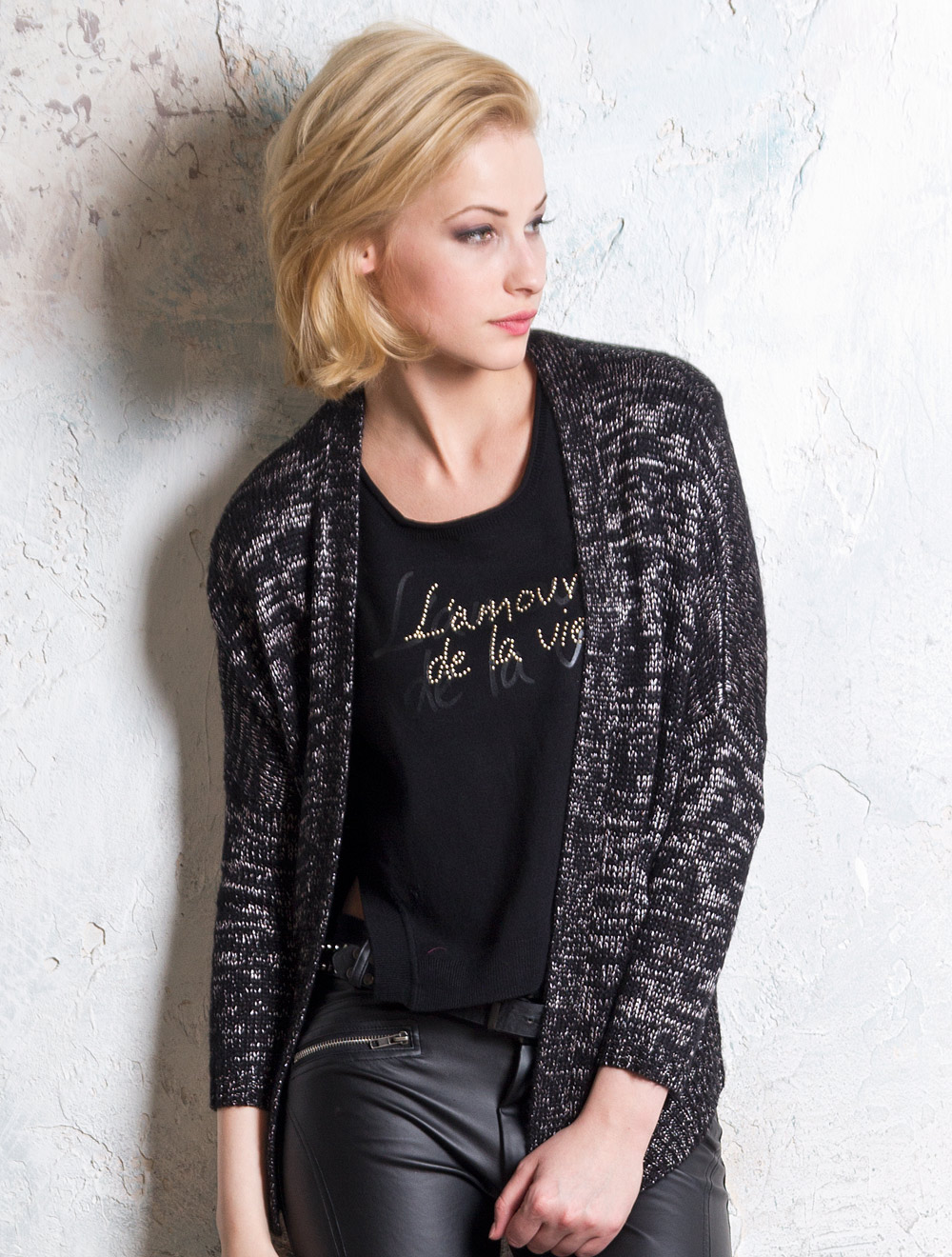Описание: Жакет выполнен крупной вязкой из микса нескольких пряж. Мягкая и теплая черная нить с мохером соединена с атласной нитью серого цвета. Силуэт свободный без застежки. Пройма спущена. Рукава узкие, связаны резинкой 1*1.