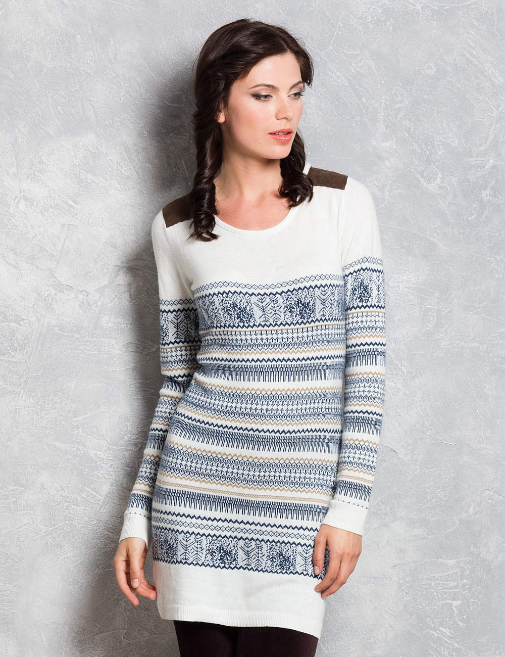 Описание: Плотная вязка из тончайшей пряжи придает изделию легкость и одновременно формоустойчивость. Плечи украшены деталями из искусственной замши коричневого цвета.