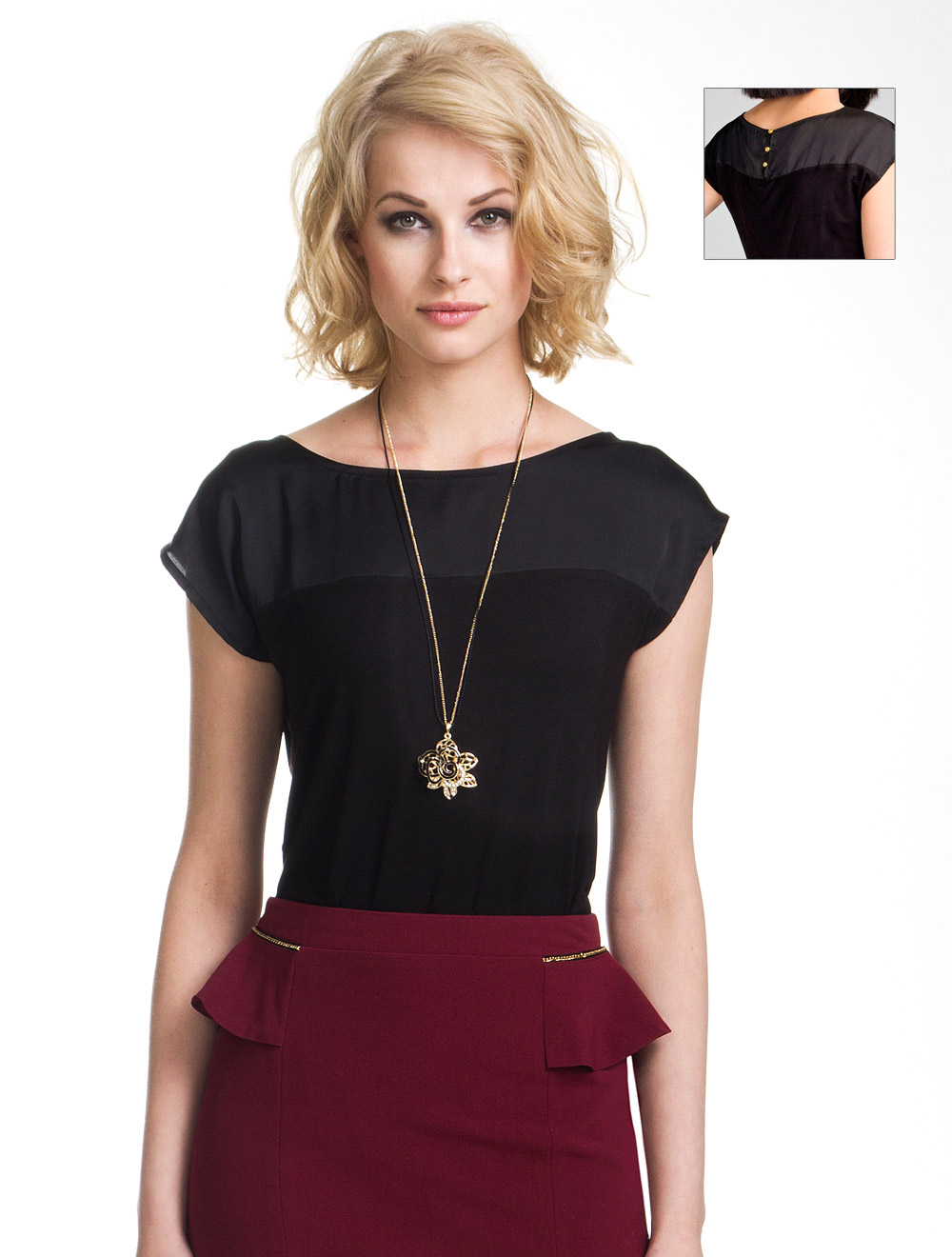 Описание: Блузка из тонкой вискозы. Верхняя часть выполнена из тонкой атласной ткани с цельнокроеным рукавом и задней застежкой на 3 пуговицы золотистого цвета. Силуэт полуприталенный и удлиненный с округлыми линиями низа спереди и сзади.