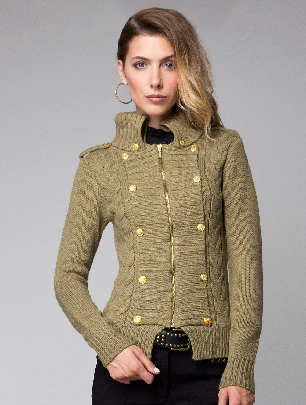 Описание: Передняя часть выполнена вязкой "косы", застежка на молнию, декоративные погоны, воротник и передняя планка упрашены золотыми пуговицами
