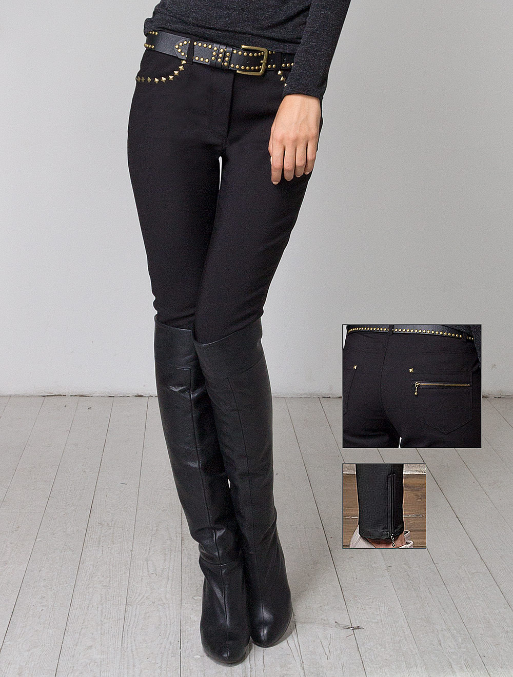Описание: Плотная, эластичная и формоустойчивая немнущаяся ткань. Джинсовый крой. Карманы украшены заклепками-пирамидками, а один задний карман металлической молнией - цвета состаренное золото