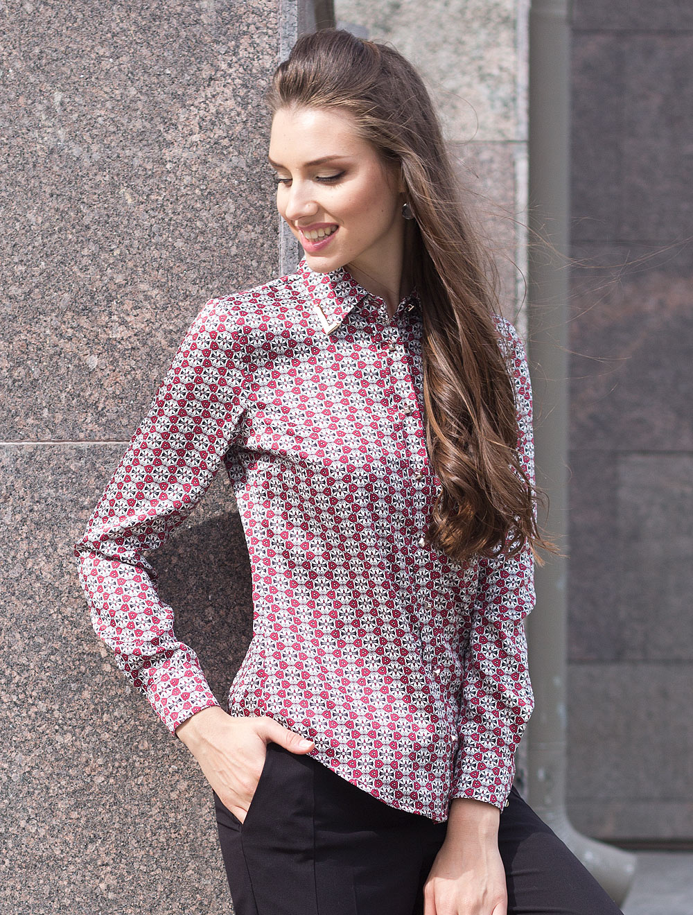 Описание: Удлиненная приталенная блуза классического кроя выполнена из атласной ткани с элегантным графичным рисунком. Металлические пуговицы в виде пирамидок на ножке, воротник акцентирован металлическими уголками золотистого цвета.
