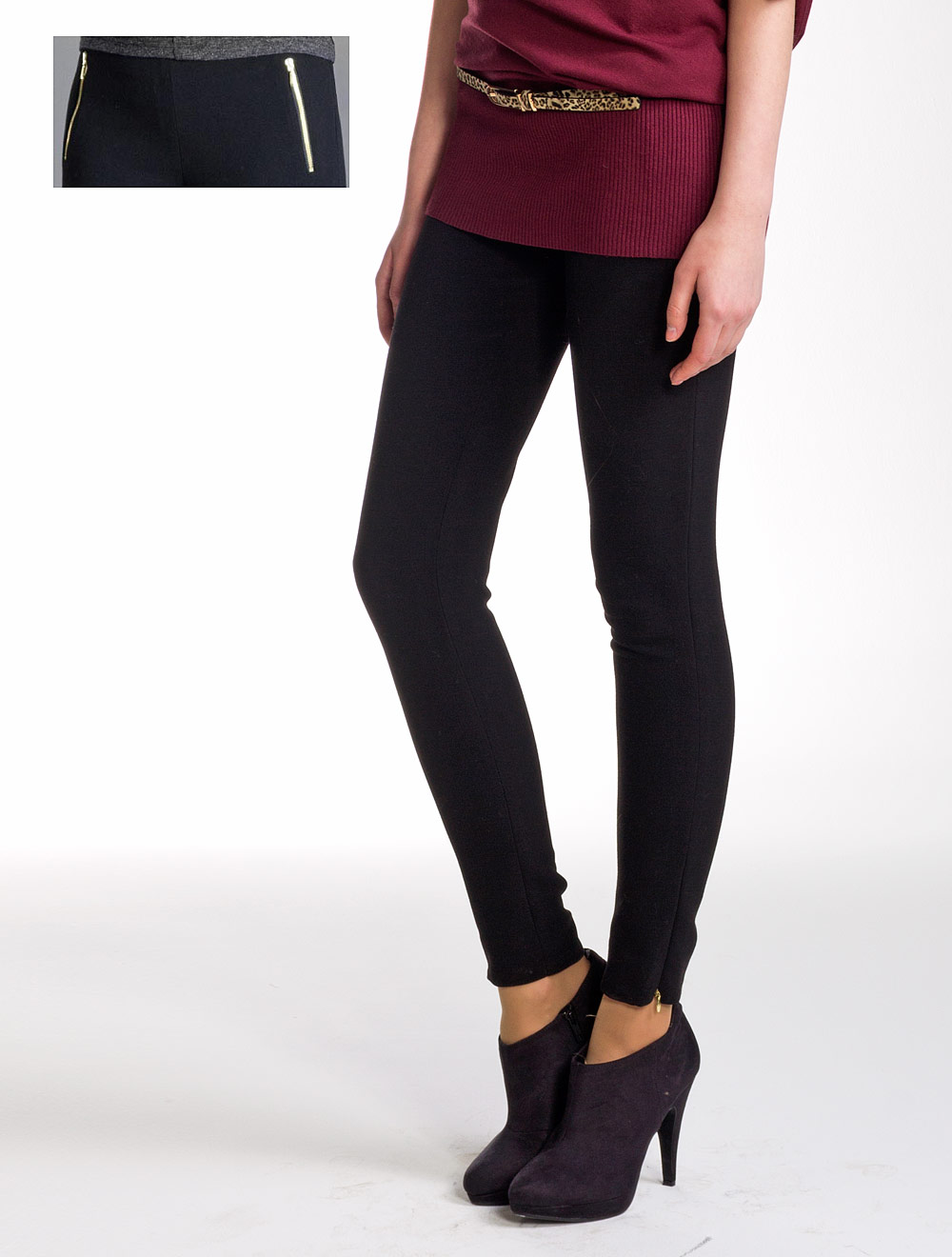 Описание: Выполнены из эластичной плотной ткани, вертикальные карманы на молнии золотого цвета, низ на потайной молнии сзолотистой подвеской.