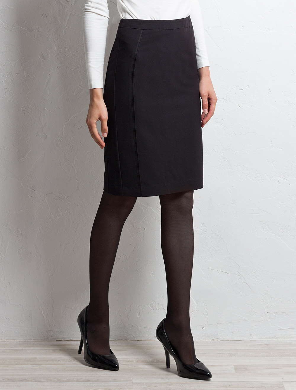 Описание: Юбка-карандаш из классической ткани на подкладке. Эффектным акцентом являются узкие полоски-вставки атласной ткани по рельефам изделия. Длина юбки в маленьких размерах чуть выше колена, в больших - ниже колена.
