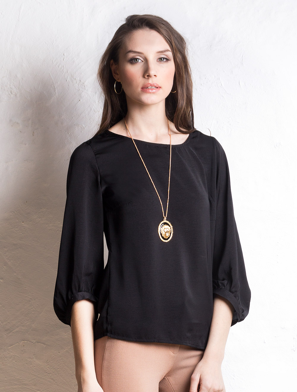 Описание: Полуматовый атлас, рукав 3/4 с ассиметричной формой положения манжеты, собирающей на сборку широкий внизу рукав.