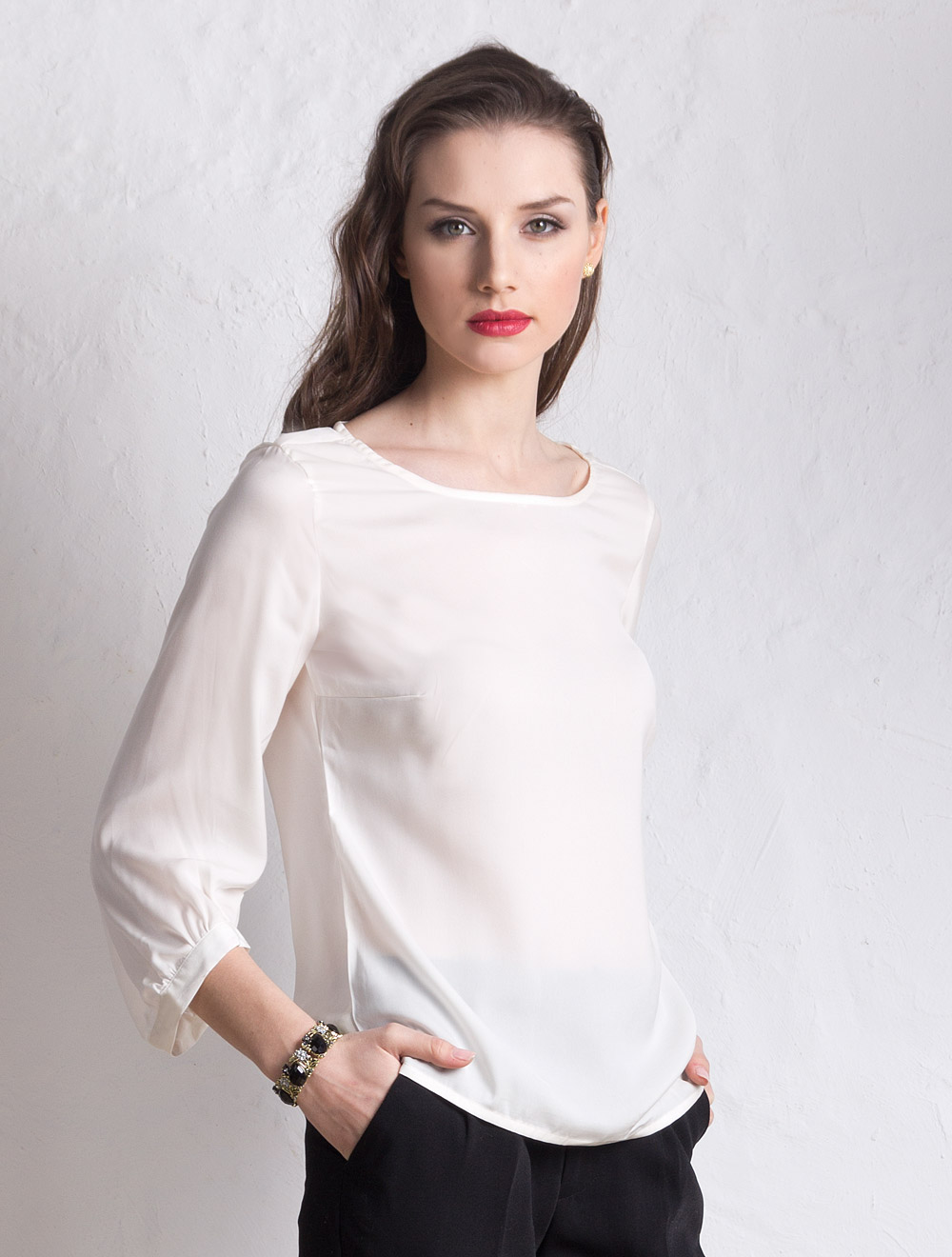 Описание: Полуматовый атлас, рукав 3/4 с ассиметричной формой положения манжеты, собирающей на сборку широкий внизу рукав.