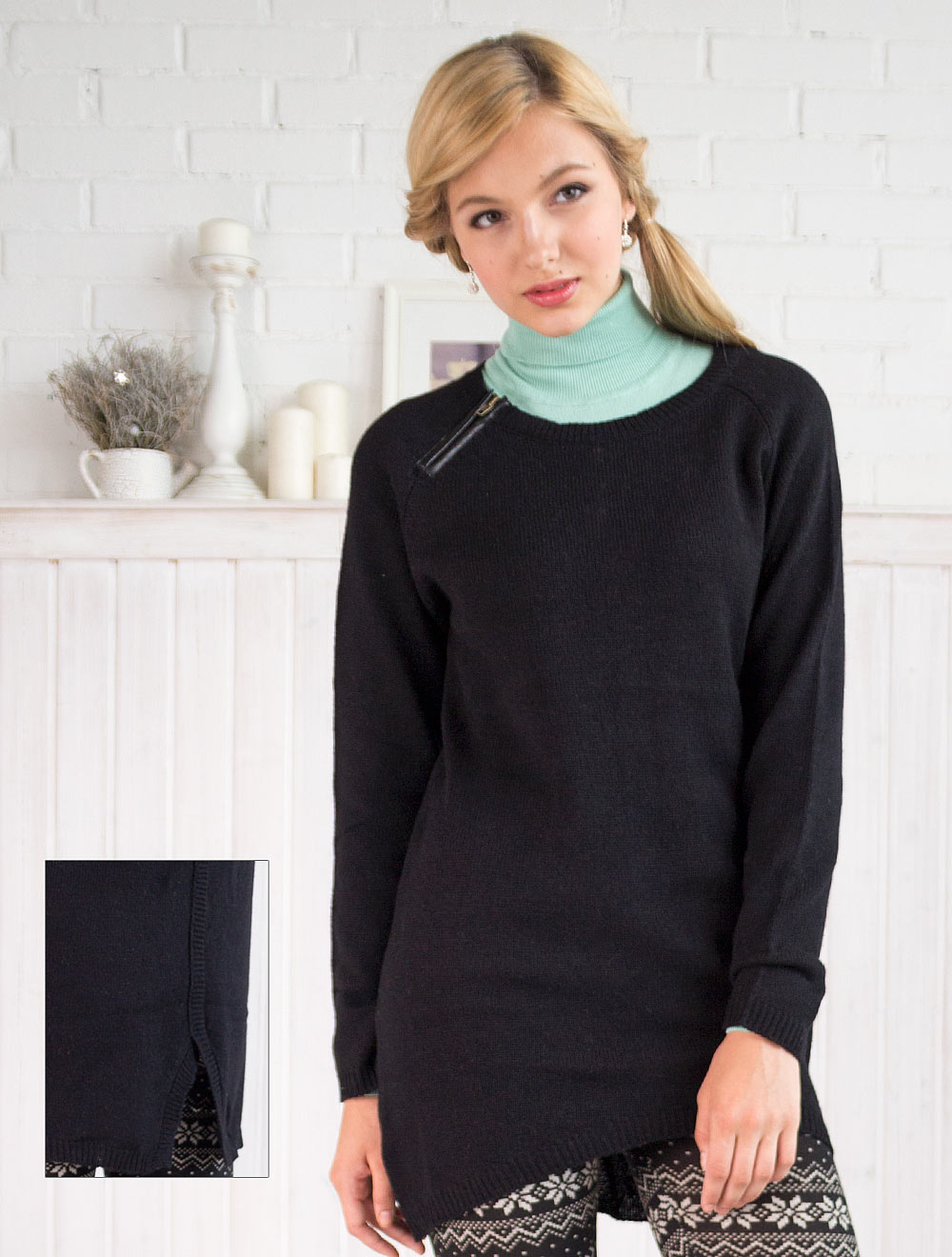 Описание: Мягкая шерсть с ангорой, свободный силуэт, плечо дополнен металлической молнией в рамке из иск кожи. Спинка удлиненная с деоративной центральной линией и разрезом внизу