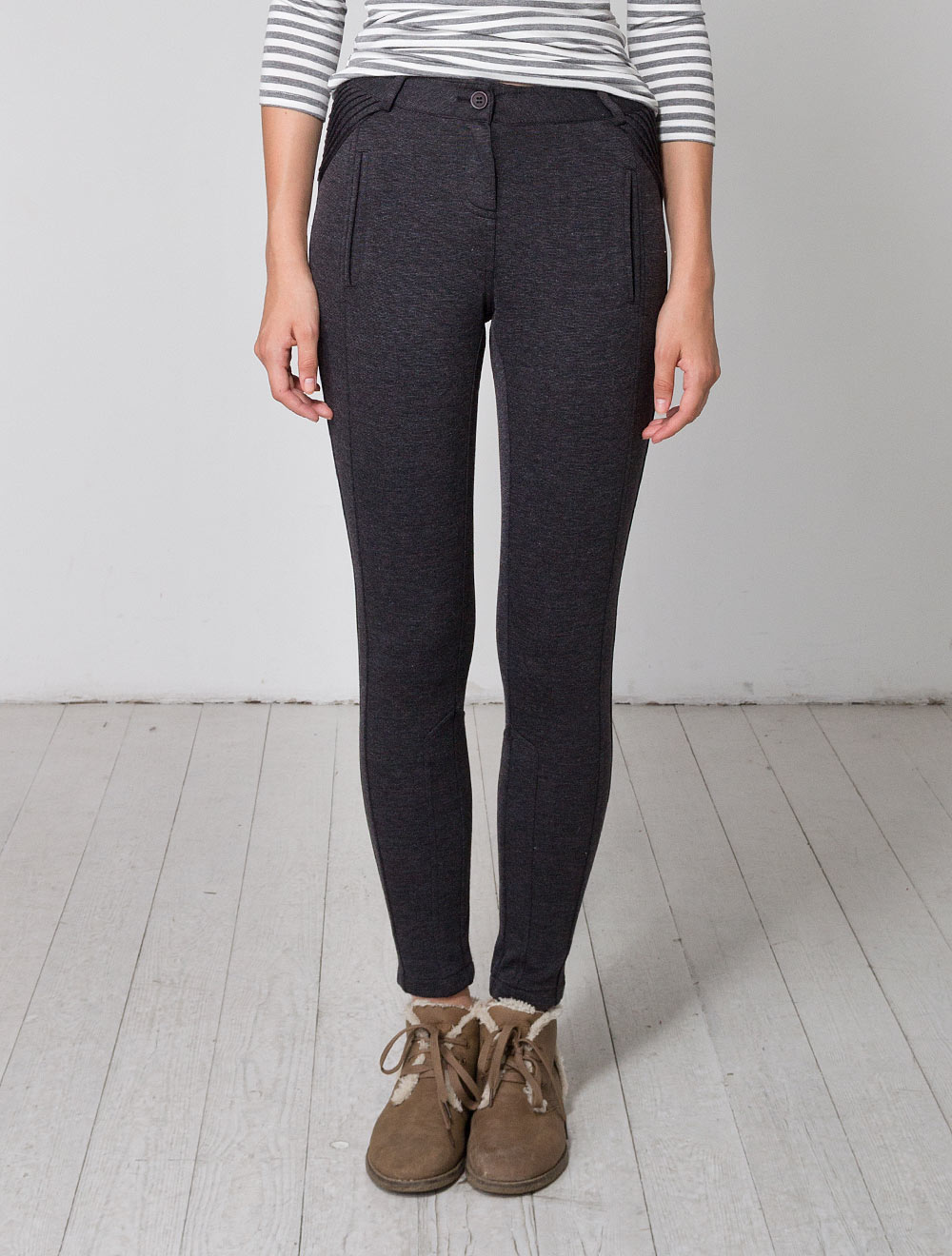 Описание: Брюки-леггинсы, зауженные к низу, выполнены из плотной ткани джерси, имеют декоративные линии кроя, отстроченные на 0,5 см эластичными строчками. Застежка сбоку на потайную молнию.