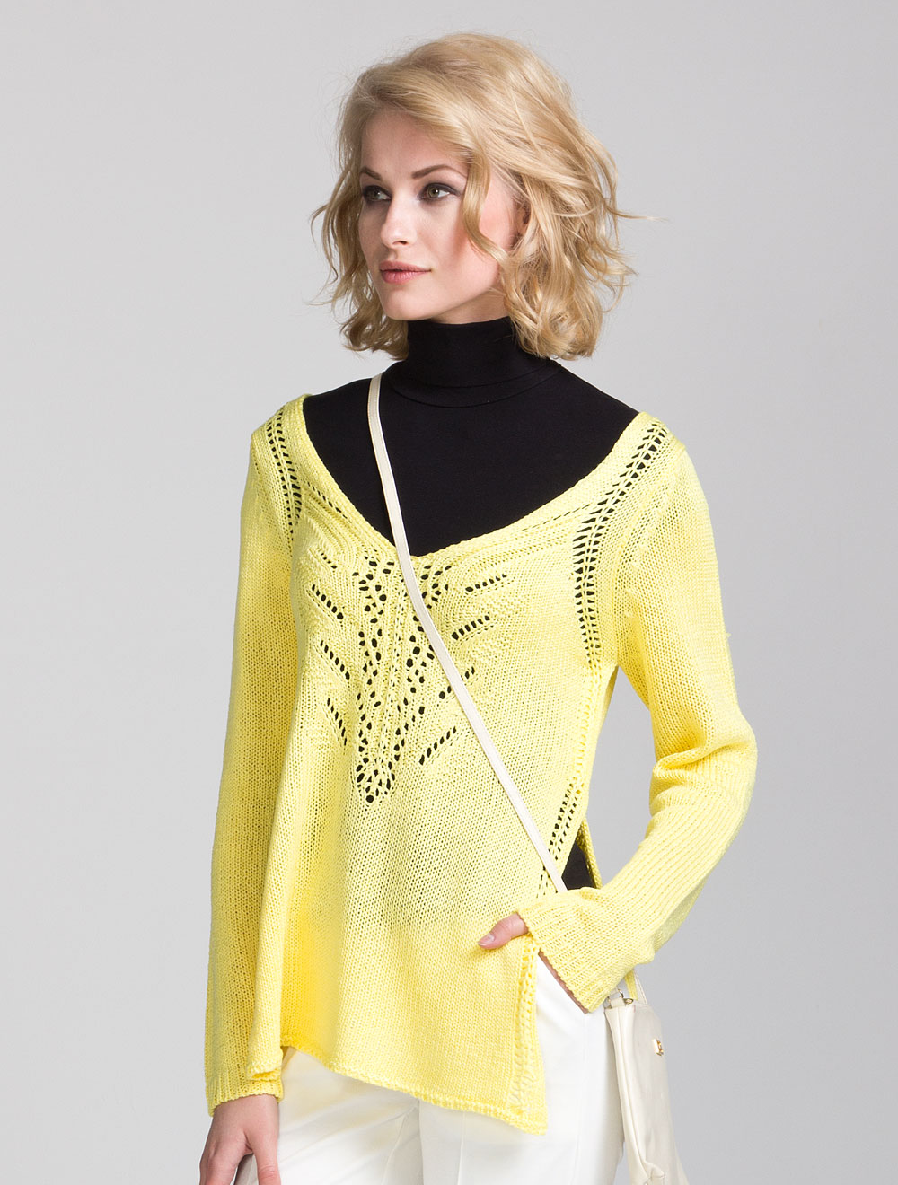 Описание: Крупная вязка из толстых нитей с атласным блеском, боковые разрезы от талии