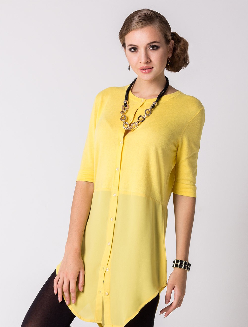 Описание: Верхняя часть до линии талии выполнена тончайшей хлопковой вязкой. Нижняя часть из летящей ткани с закругленными нижними срезами. Изделие можно носить, как кардиган или как супер-актуальное платье-рубашку.