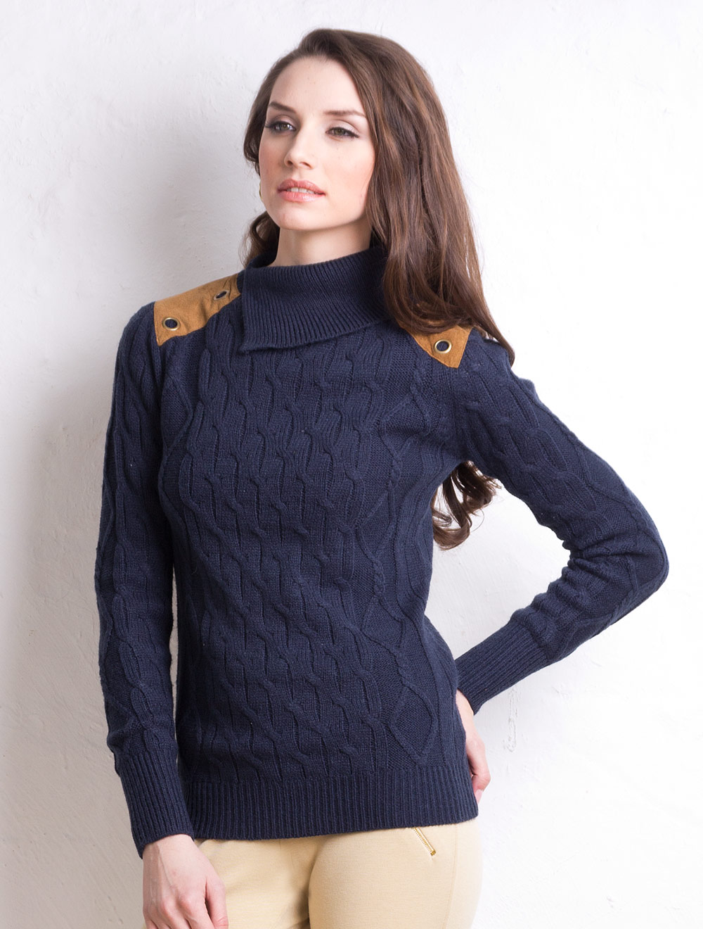 Описание: Крупная шерстяная вязка косами. Джемпер удлиненный с фантазийной формой ворота. Плечи украшены иск. замшей с крупными люверсами.