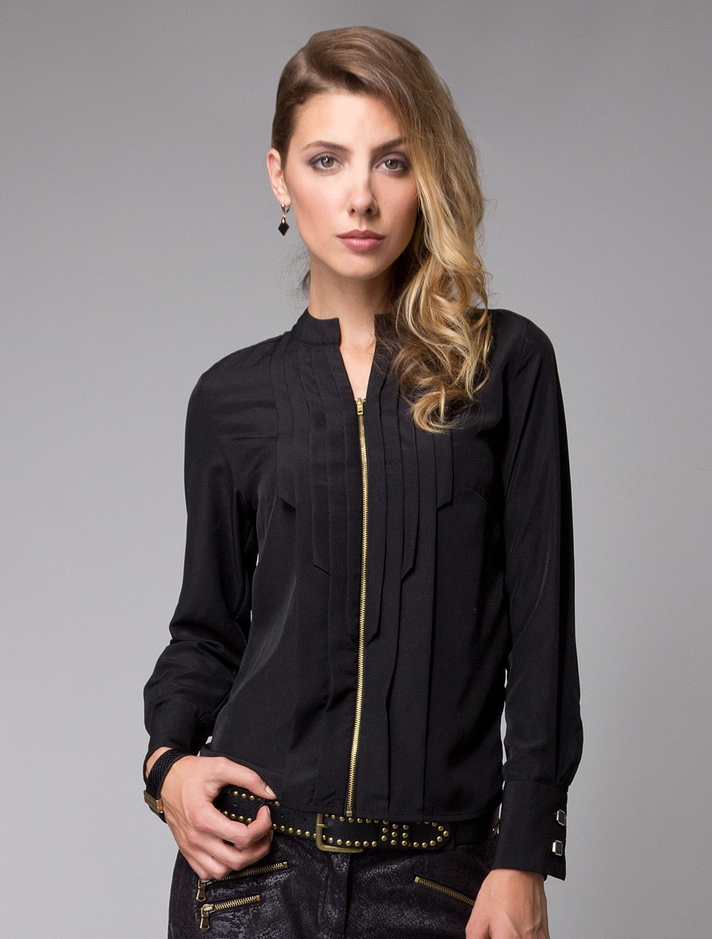 Описание: Полиэстер матовый, средней плотности. На передней части заложено несколько рядов застроченных складок. Застежка на металлическую молнию. Воротник - узкая стойка. Крупные декоративные пуговицы на манжетах.