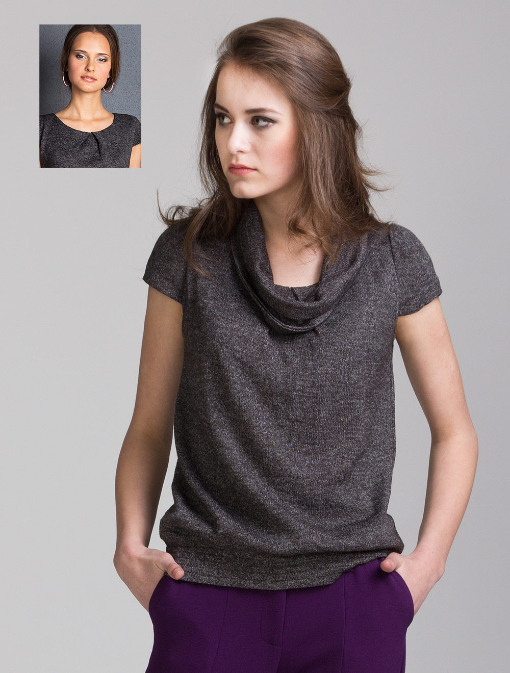 Описание: Изделие на тончайшей трикотажной подкладке, ворот "хомут" отстегивается, открывая глубокий круглый вырез горловины. Низ изделия на нескольких линиях эластичных нитей