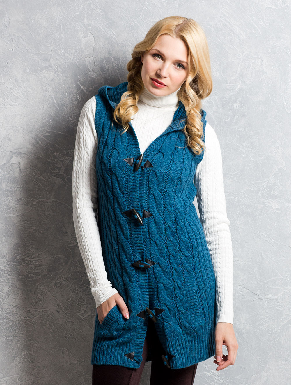 Описание: Передняя часть выполнена вязкой "косы", застежка на крупные деревянные цилиндрические пуговицы.