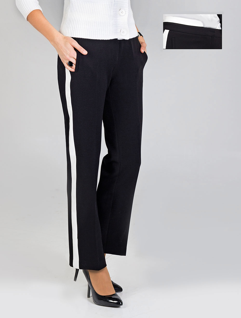 Описание: Выполнены из формоустойчивой и эластичной ткани средней плотности. Пояс украшен контрастными белым вставками, что эффектно выглядит при носке верхнего топа в заправку, боковые швы украшены белыми лампасами шириной 2,5 см.