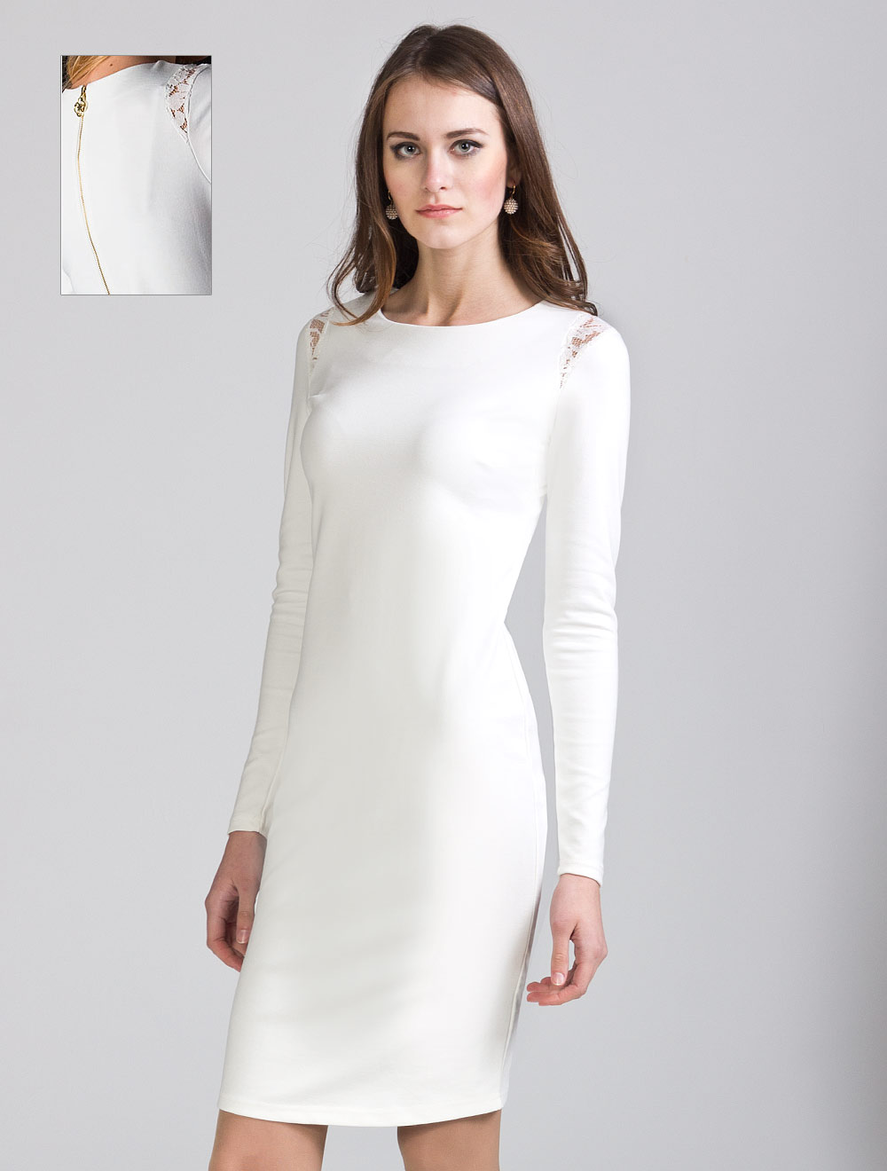 Описание: Выполнено из плотного полотна джерси, плечи украшены вставками из кружева, на спине длинная золотистая молния с нарядной подвеской.